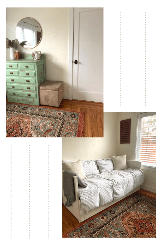 - Daybed: I scored this beauty from FB Marketplace for $150. Since it’s a small room, the bed works great in here and I love the versatility of having it fold out into a king bed for guests.